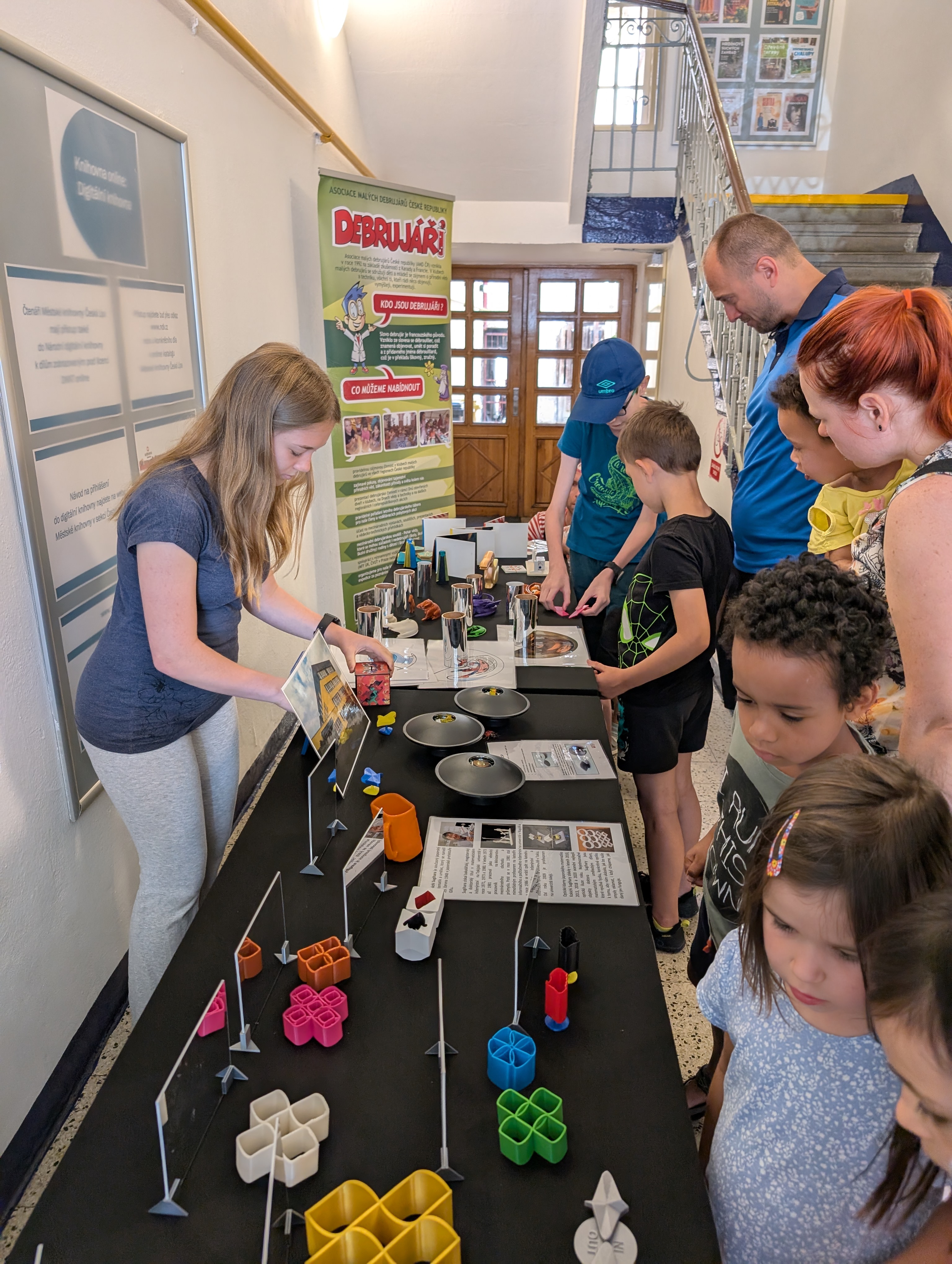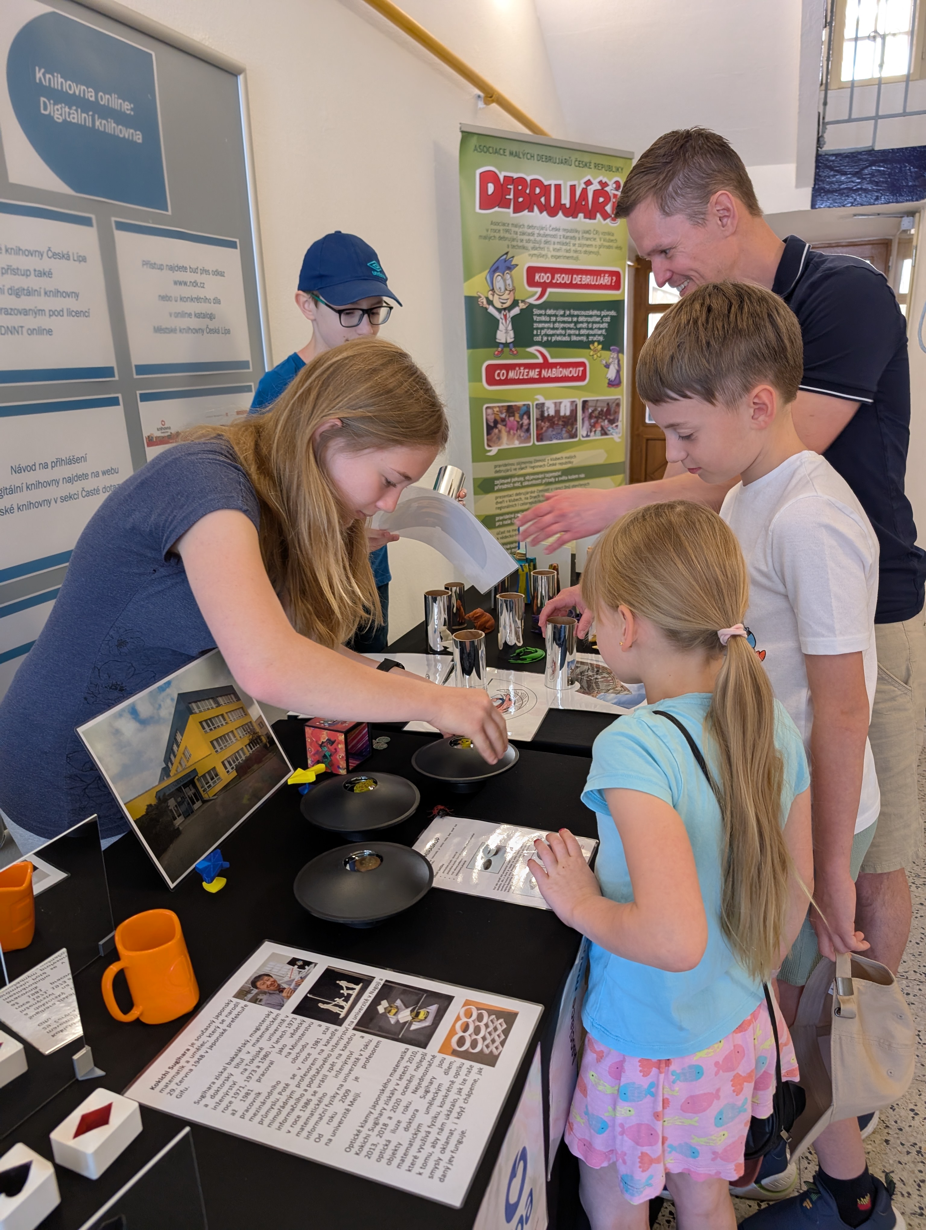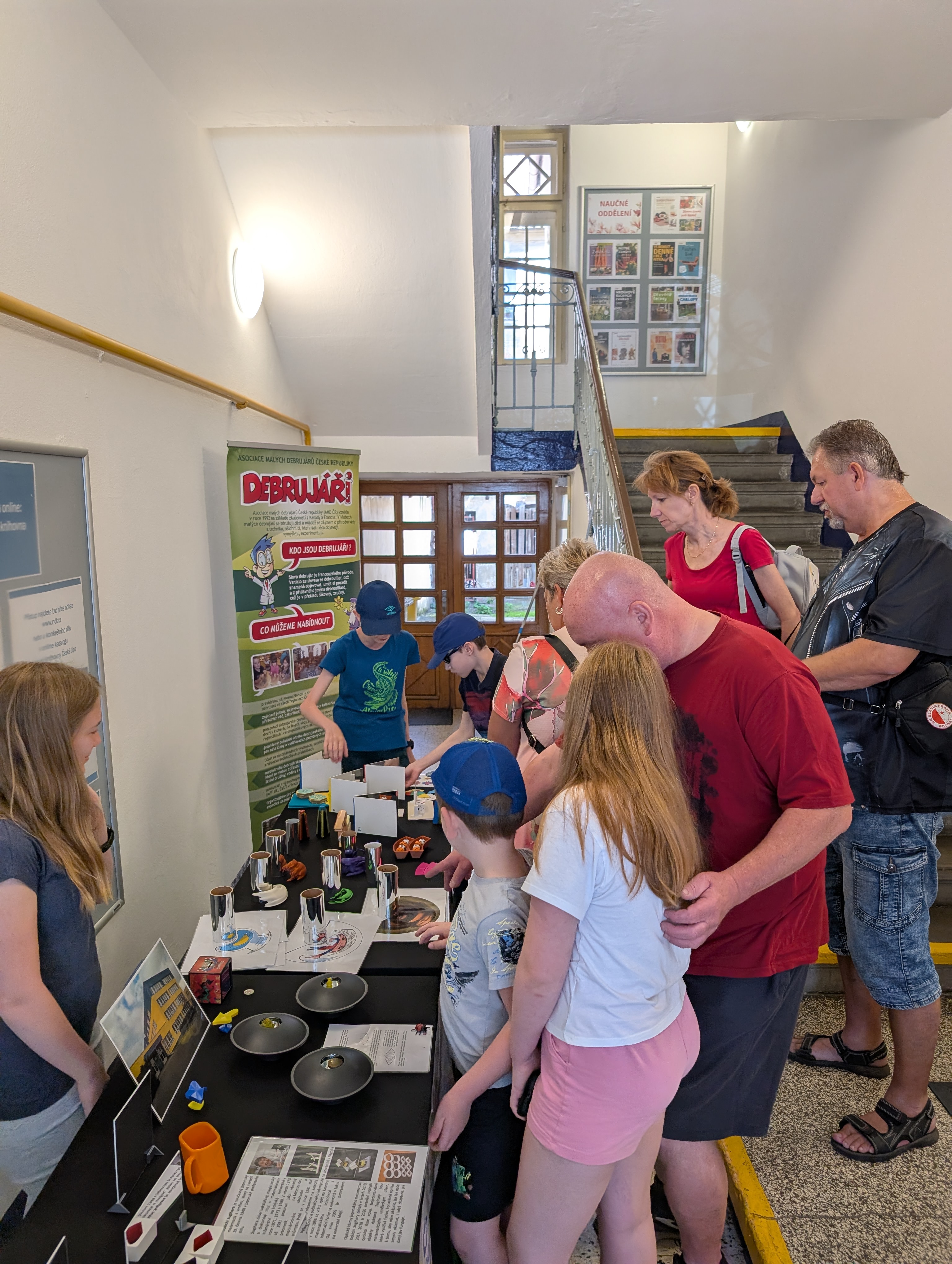Debrujáři měli svůj interaktivní science stánek v prostorách Městské knihovny na náměstí T. G. Masaryka, kde doplňovali program expozice Úžasného divu světa fyziky (ÚDiFu), představili pokusy se zrcadly, optické klamy, fyzikální experimenty i další vědecká „kouzla“. Prostor na chodbě nebyl zrovna největší, ale debrujáři ho proměnili v místo plné zájmu – ukázali svou vynalézavost a dovednosti i v omezeném prostředí. Členové klubu svými ukázkami přitáhli pozornost nejen dětí, ale i dospělých návštěvníků, pro které připravili inetraktivní expozici. Pro debrujáry to navíc byla výjimečná příležitost – mohli fungovat jako „předskokani ÚDiFu“, což byl pro ně velký zážitek.