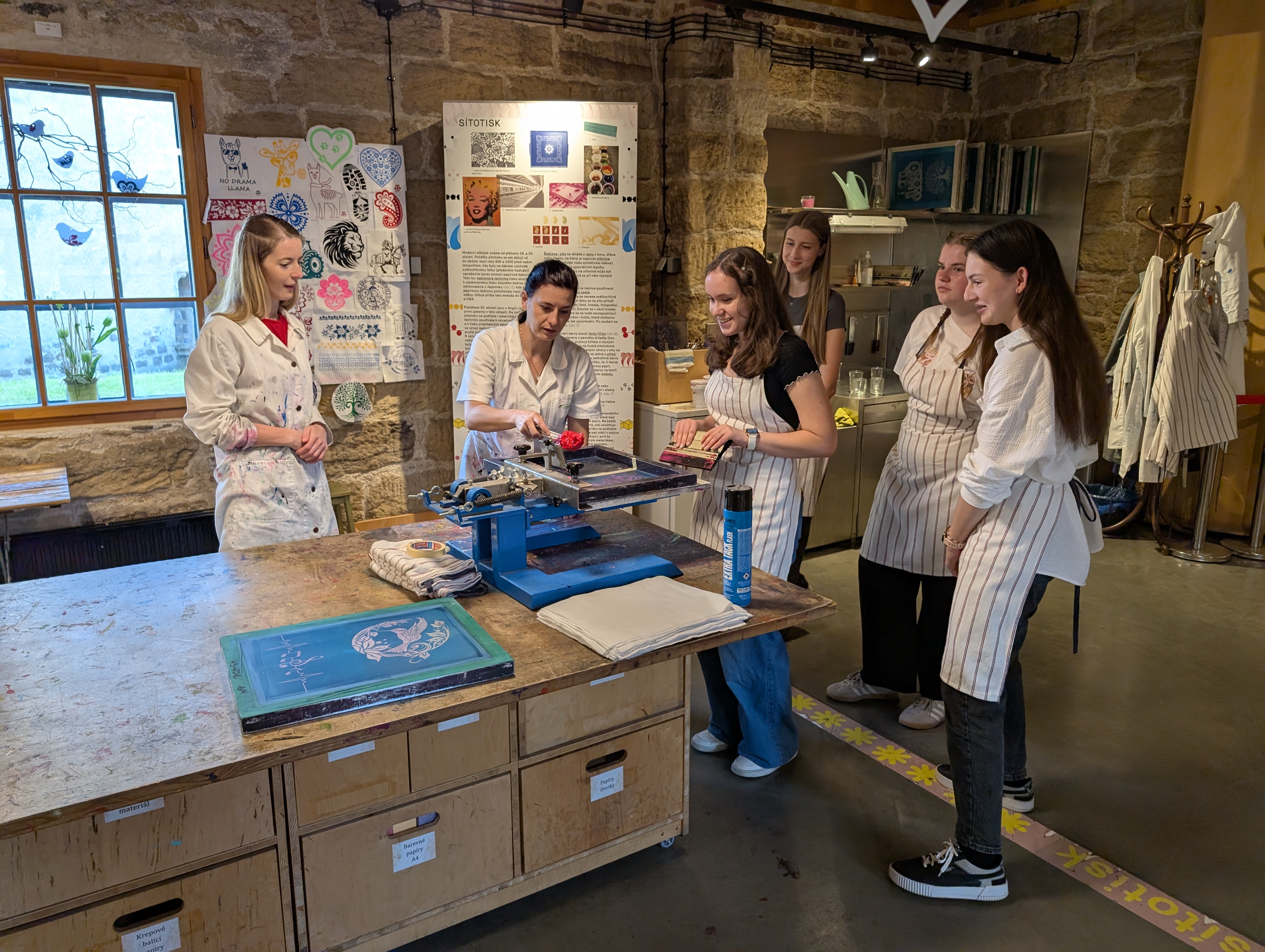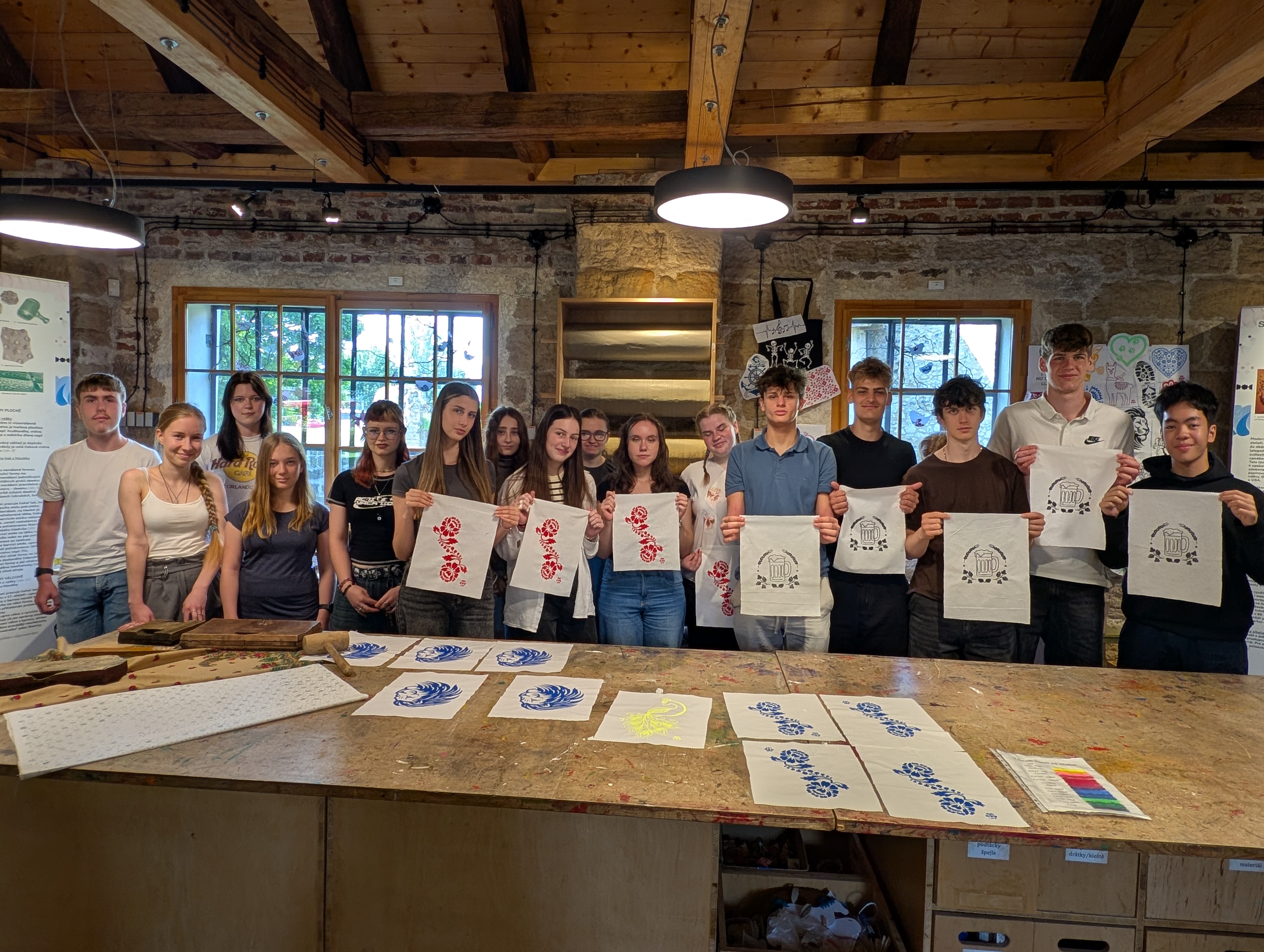 Další den se studenti věnovali textilnímu tisku. Naučili se jednoduché techniky tisku na látku a vyzkoušeli si výrobu vlastního malého plátěného díla. Přitom poznali historii tisku a zjistili, jak náročná byla práce tiskaře dříve.